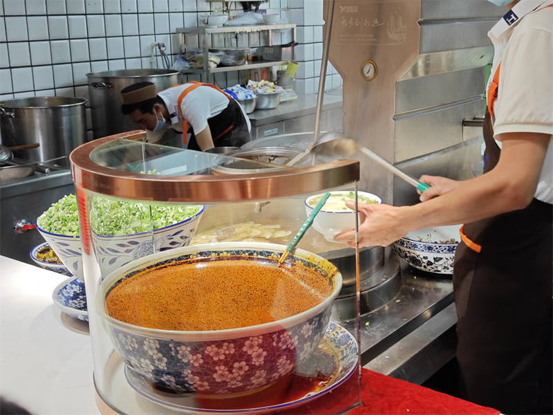 推開雕花木門,迎面是整面夯土墻上懸掛的銅制湯勺,每把勺柄都磨得锃亮,記錄著三代匠人的歲月留痕。正值晌午,穿羊皮襖的老漢與西裝革履的年輕人并肩而坐,粗瓷老碗里升騰的熱氣模糊了身份差異。柜臺(tái)后的姑娘麻利地喊著“毛細(xì)!韭葉!大寬!”,跑堂的小伙兒托著木盤穿梭如魚,青花海碗與紅油辣子碰撞出清脆聲響。最里間的八仙桌上,歸國游子正將面條仔細(xì)卷在筷尖,氤氳熱氣中,父親教他吃面的場(chǎng)景忽然清晰如昨——原來鄉(xiāng)愁的滋味,是湯里那抹始終如一的茴香回甘。